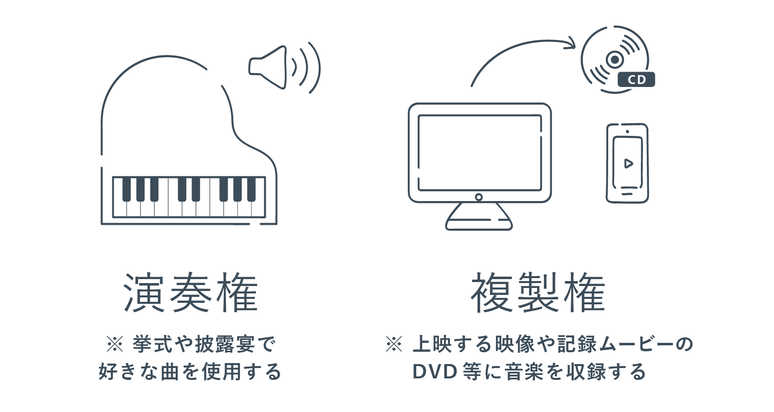 上映する映像や記録ムービーなど別の媒体に音楽を収録する「複製権」なども含まれます