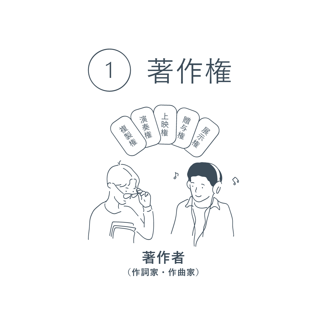 (1)著作権- 作詞家や作曲家等の著作者が創作物を守り「第三者の楽曲使用を制限できる権利」です