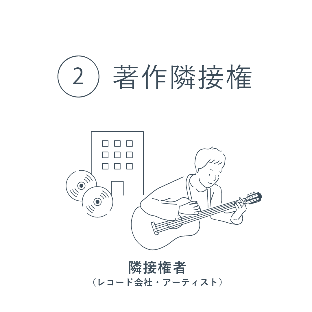 (2)著作隣接権- 著作者本人以外の著作物を広めるアーティストやレコード会社等が持つ「録音された音に対しての権利」です